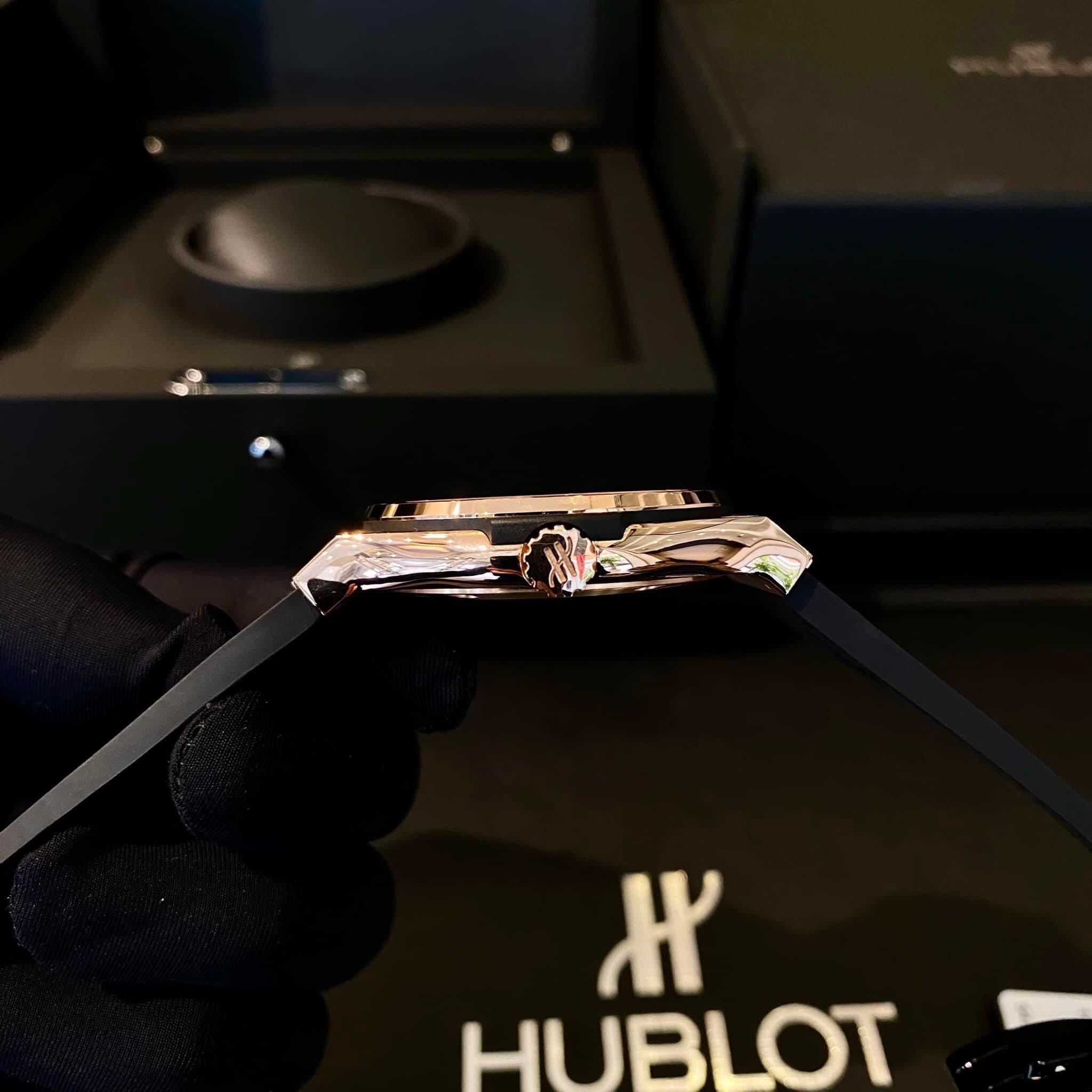 Từ cái nhìn đầu tiên, Hublot Kinggold Black 42mm gây ấn tượng mạnh bởi vẻ đẹp hoàn hảo trong từng chi tiết. Vỏ đồng hồ được làm từ vàng hồng, tạo nên một sự kết hợp tuyệt vời giữa màu sắc ấm áp và độ bền. Niềng bezel được trang trí bằng những viên kim cương tinh tế, tạo điểm nhấn lộng lẫy và độc đáo cho chiếc đồng hồ này. Với kích thước 42mm, nó vừa vặn trên cổ tay và thể hiện sự tỉ mỉ trong từng chi tiết thiết kế.