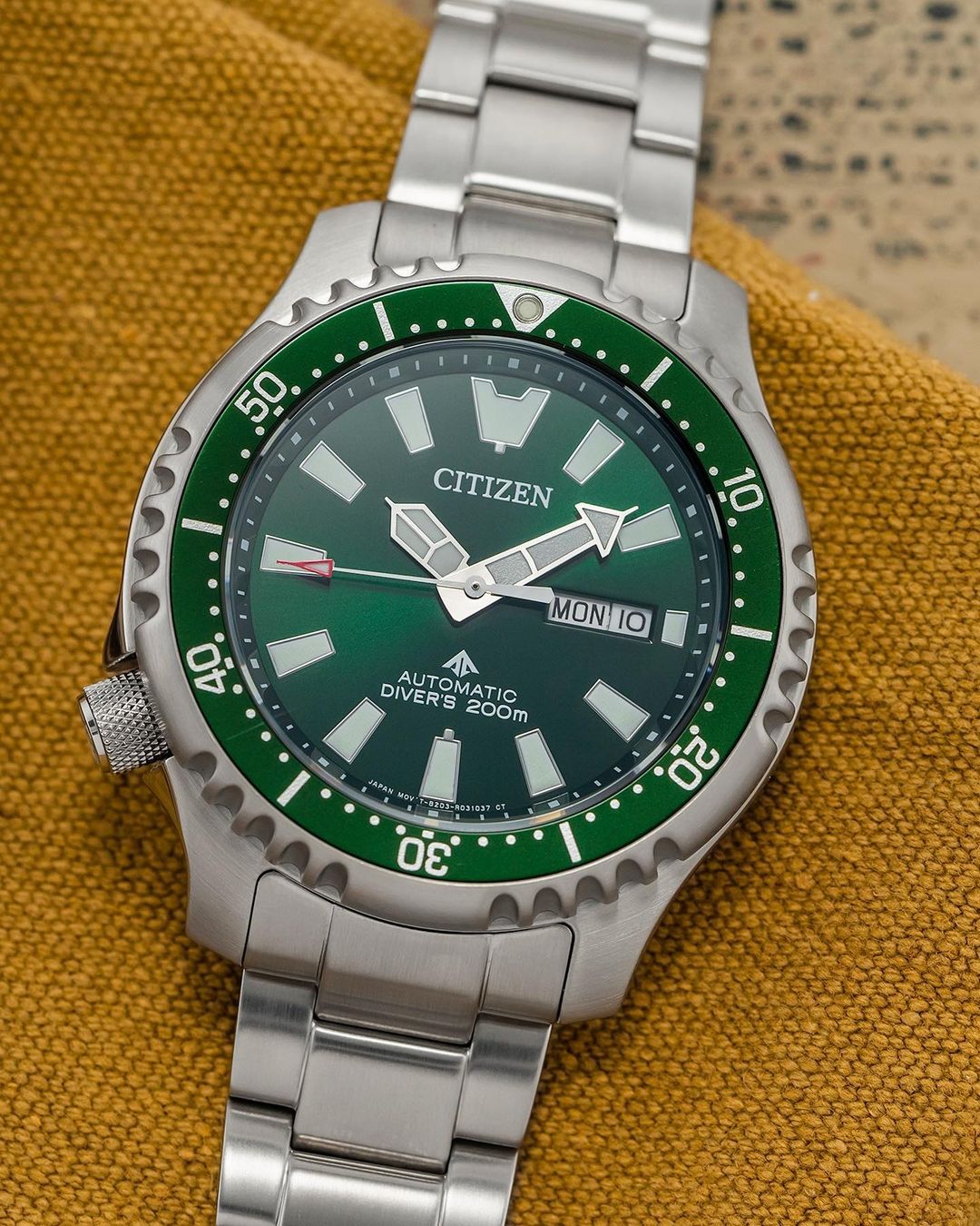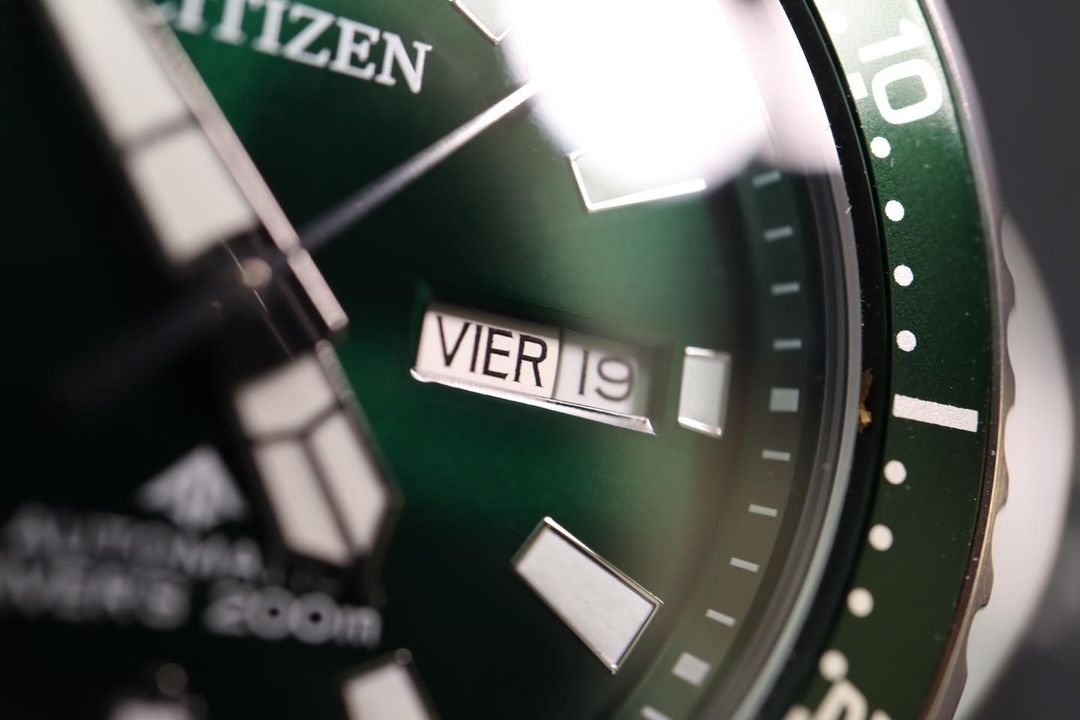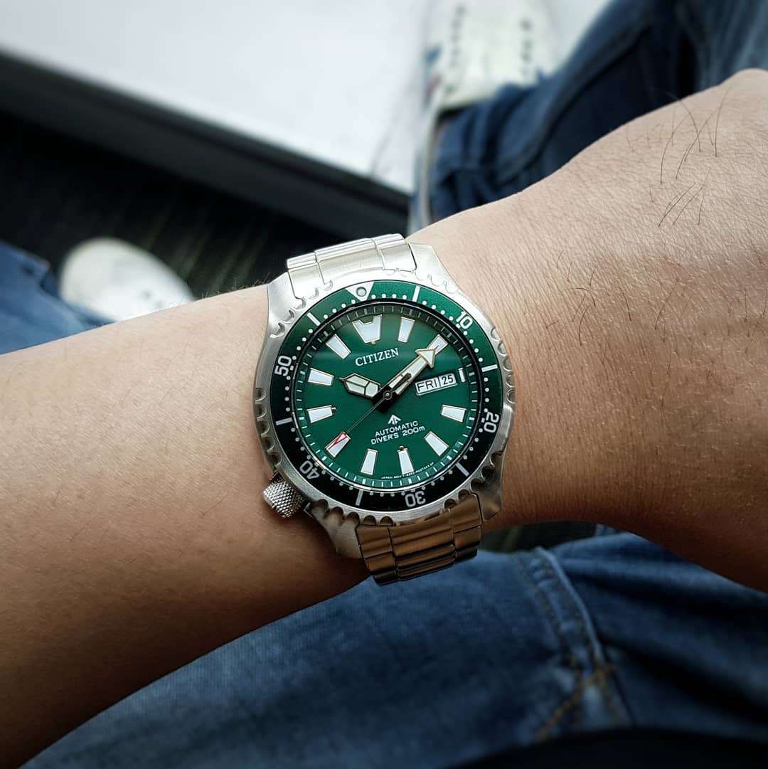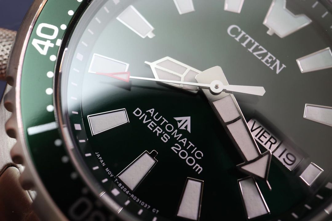 Đồng hồ nam tự động Promaster Dive mới của Citizen là một phiên bản hoàn thiện dựa trên kiểu dáng kinh điển đặc trưng. Để hiểu sâu hơn về lịch sử của phiên bản ban đầu, đây là một chiếc đồng hồ lặn được sử dụng bởi Hải quân Italy và ra mắt vào năm 1989, nhằm đáp ứng nhu cầu của thế hệ yêu thích đồng hồ lặn mới. Một yếu tố thiết kế nổi bật là viền lượn sóng đặc trưng, lấy cảm hứng từ cá nóc (hay còn được gọi là "fugu" trong tiếng Nhật). Chiếc đồng hồ có vỏ 3 mảnh kích thước 44mm, kính đá sapphire và dây đeo bằng thép không gỉ màu bạc. Viền xoay màu xanh lá cây có vòng nhôm dễ cầm bao quanh mặt số xanh lá cây với kim và cọc phản quang. Mặt sau của vỏ đồng hồ được khắc hình ảnh của cá nóc. Đồng hồ thể thao cao cấp này được trang bị công nghệ tiên tiến và phong cách, đi kèm với hộp đựng đặc biệt dành cho người sưu tầm và tuân thủ tiêu chuẩn ISO, có núm vặn và chống nước đạt đến 200 mét. Máy Caliber 8204.