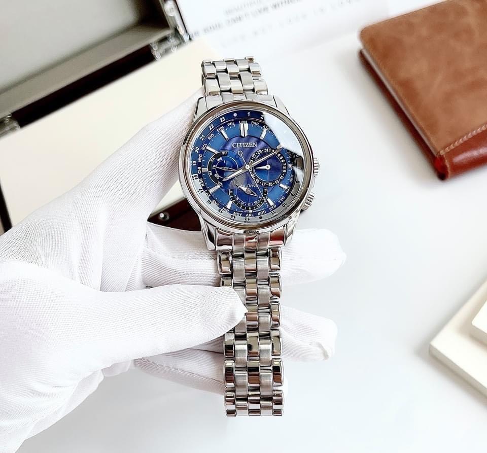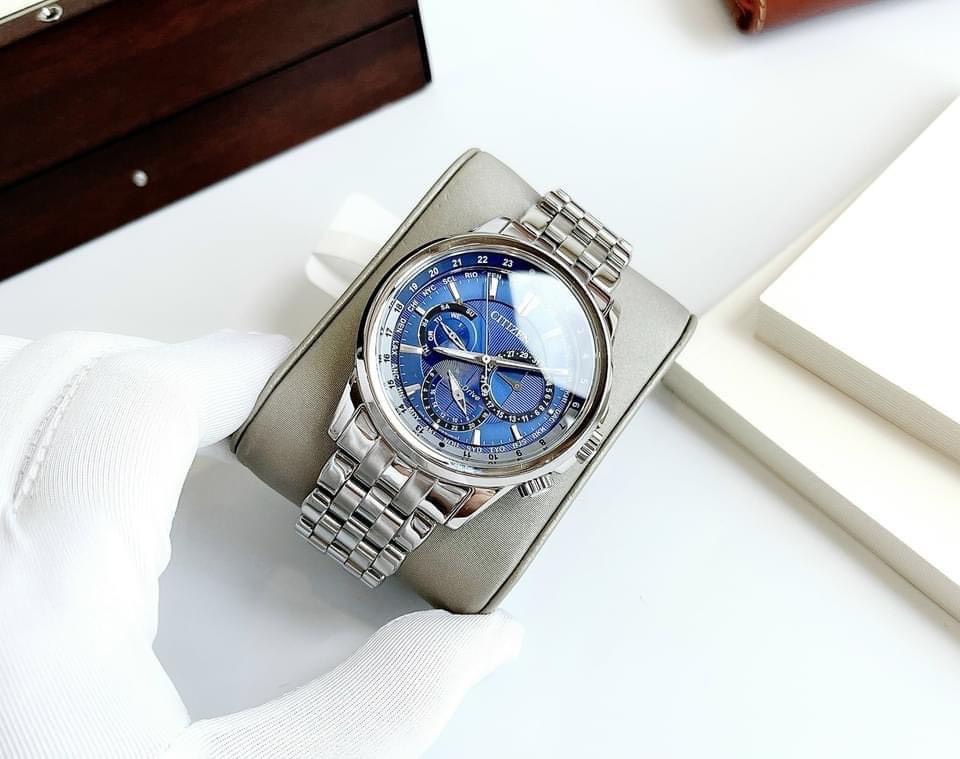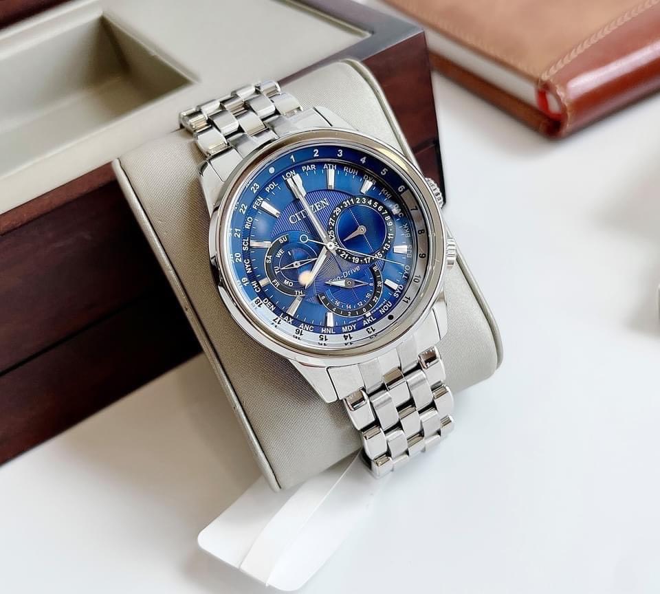 Mẫu đồng hồ nam CITIZEN Japan Calendrier Eco-Drive World Time với mặt số màu xanh đậm và kim cương Ray.