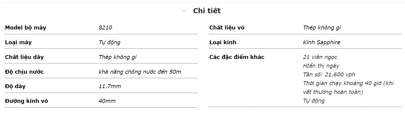 Đồng hồ cơ tự động không cần thay pin và có chức năng lên dây thiều phụ để hỗ trợ khi không sử dụng, đồng hồ vẫn hoạt động bằng cách vặn nút chỉnh giờ khoảng 15 đến 20 lần theo chiều kim đồng hồ.