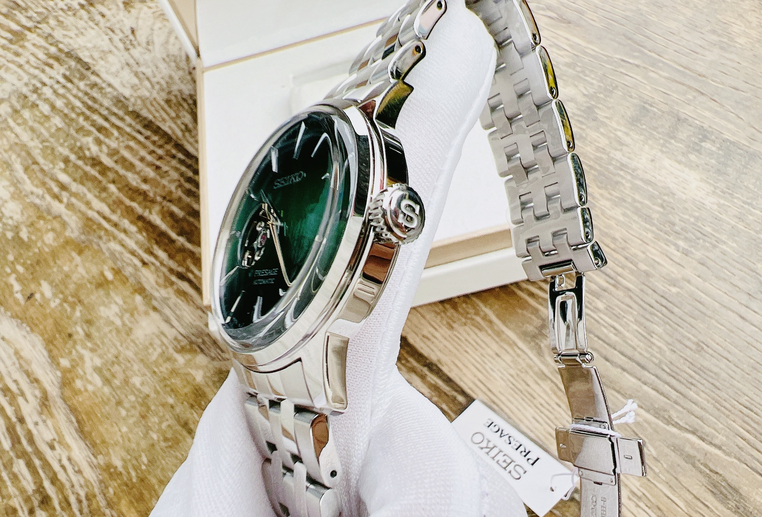 Seiko Presage Cocktail Time Grasshopper SSA441J1 sử dụng máy Automatic 4R38, với các tính năng như chống từ, hacking và hand winding, đảm bảo sự chính xác và tiện lợi trong sử dụng. Dial màu green được trau chuốt rất chi tiết, tỉ mĩ, tạo nên một vẻ đẹp độc đáo và thu hút ánh nhìn.