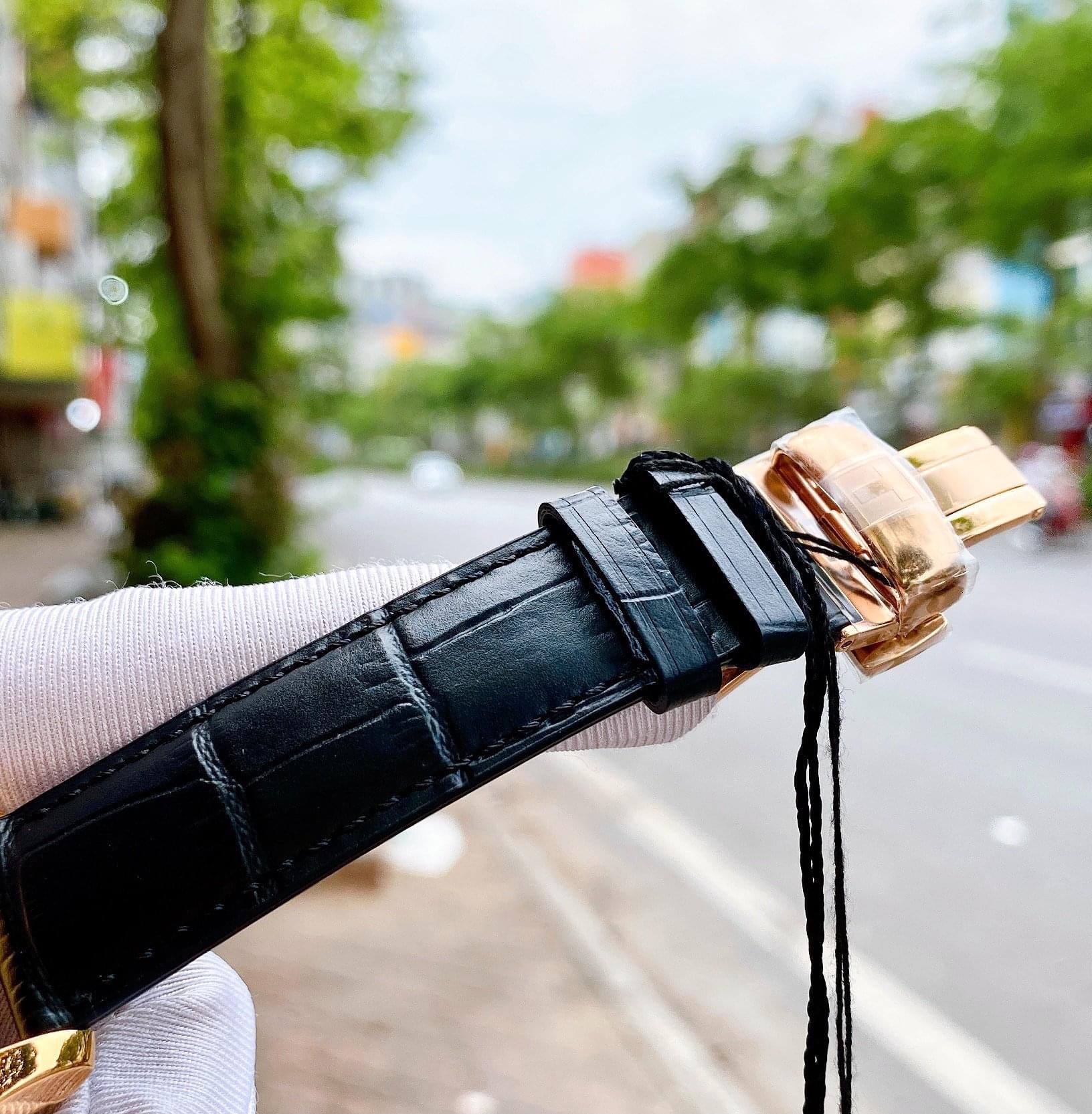 Dây da đen với vân cá sấu đi kèm khóa bướm tiện lợi, tăng thêm sự sang trọng và thoải mái cho người đeo.