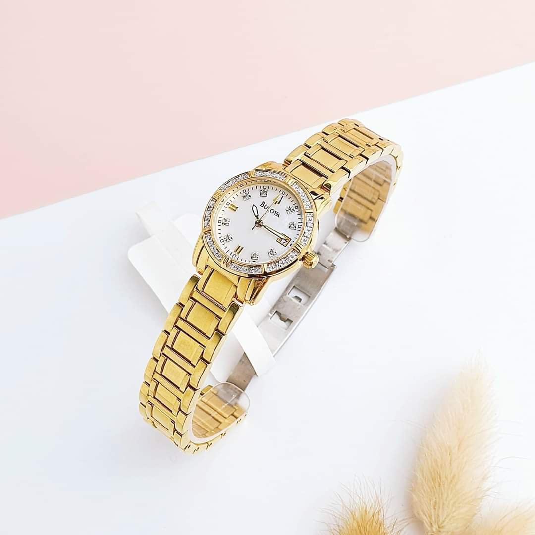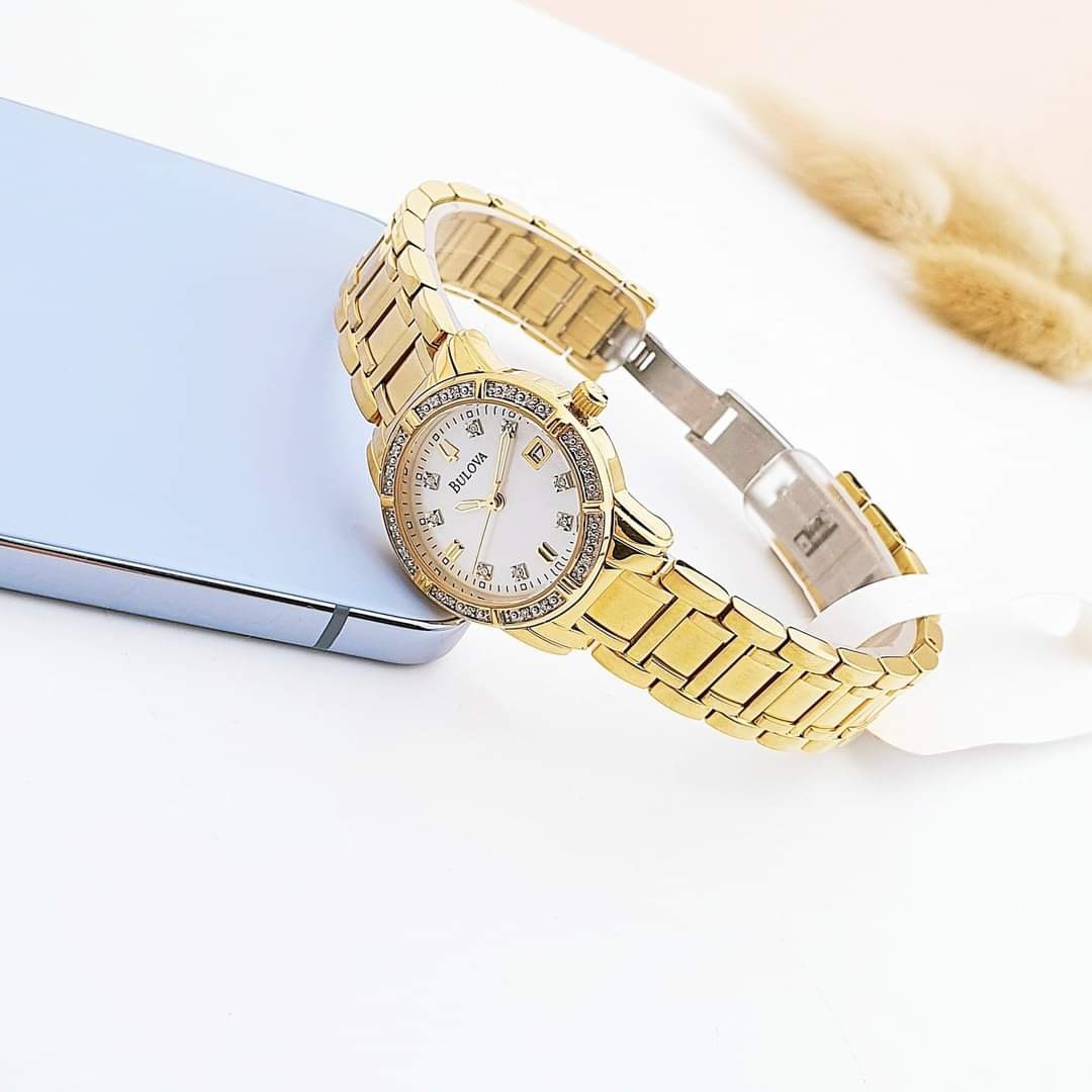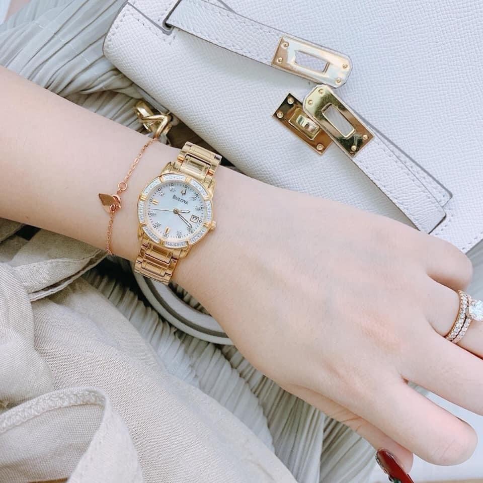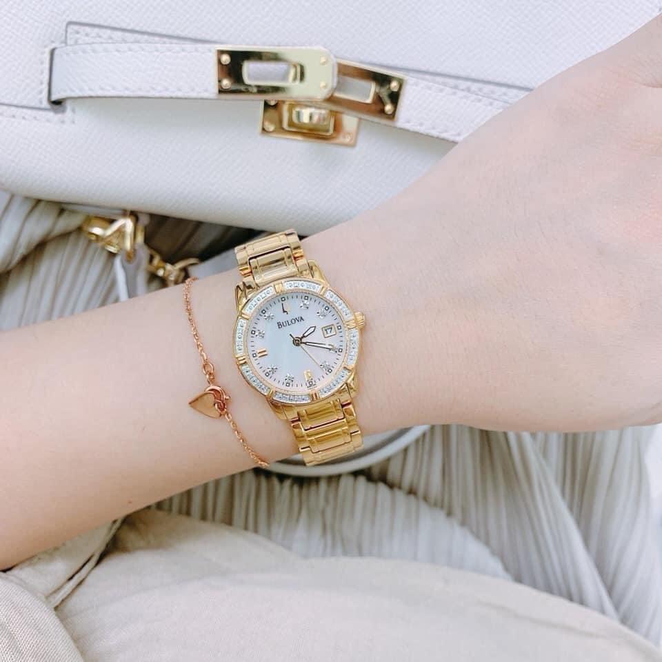 Màu vàng của Bulova 98R165 là điểm nhấn nổi bật, tạo nên sự sang trọng và quý phái cho người đeo. Viền và cọc số được đính kim cương tinh tế, tạo nên vẻ lấp lánh và rực rỡ.