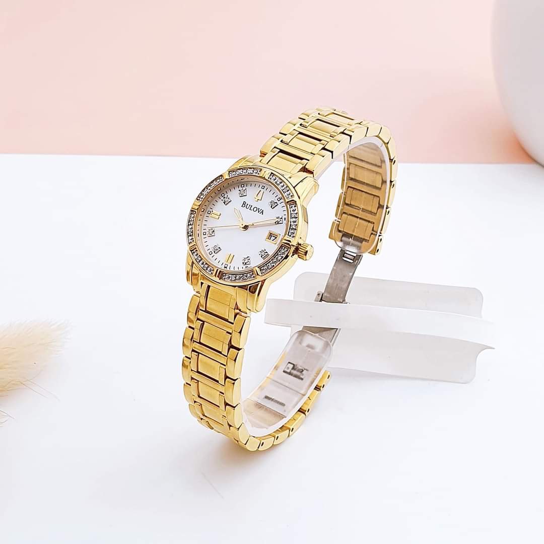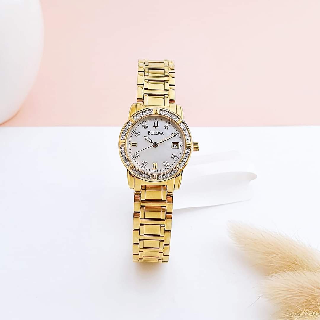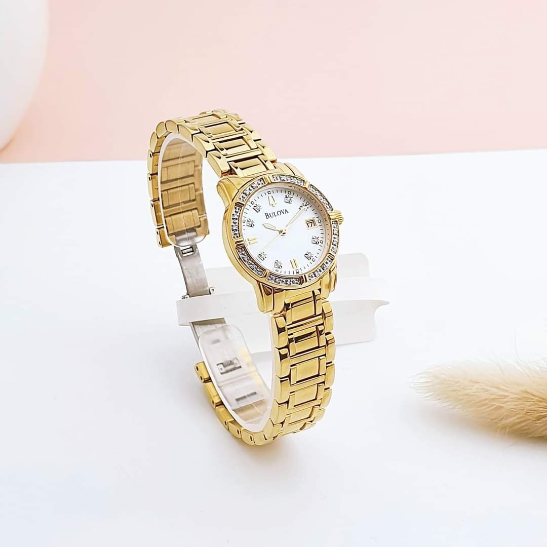 Màu vàng của Bulova 98R165 là điểm nhấn nổi bật, tạo nên sự sang trọng và quý phái cho người đeo. Viền và cọc số được đính kim cương tinh tế, tạo nên vẻ lấp lánh và rực rỡ.