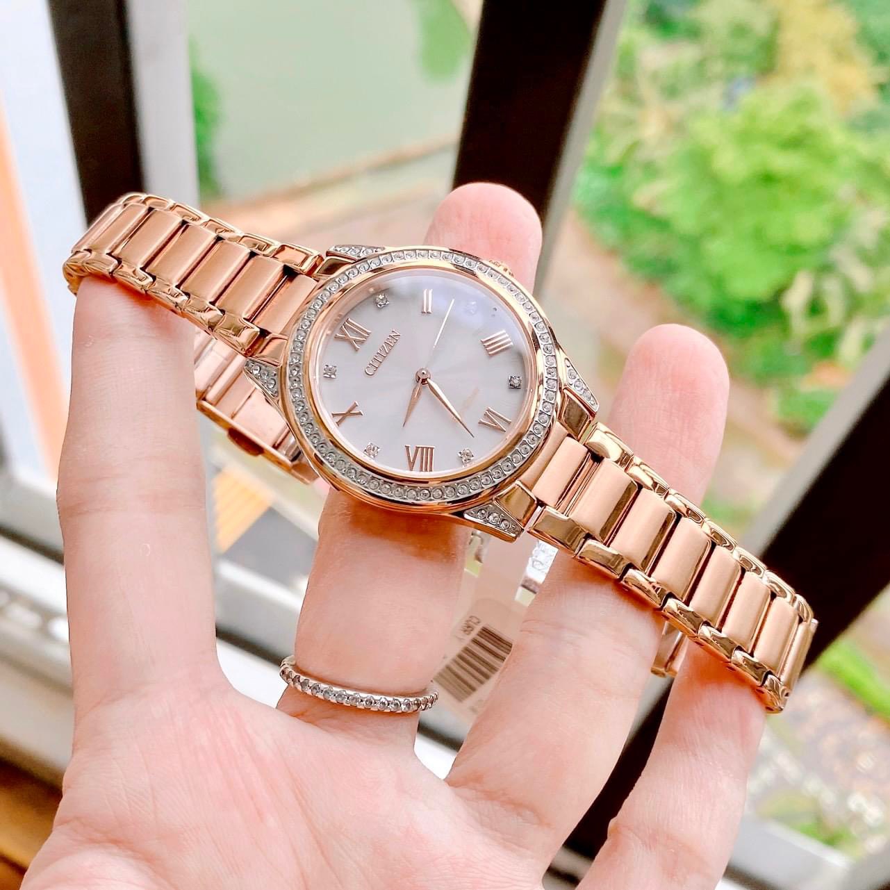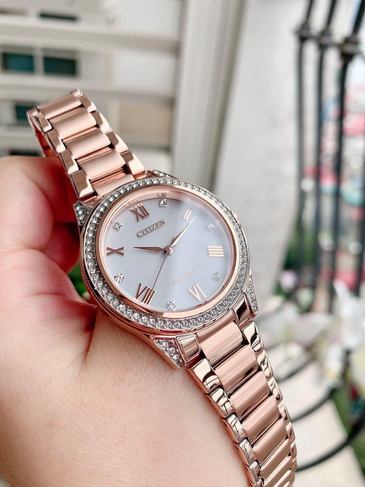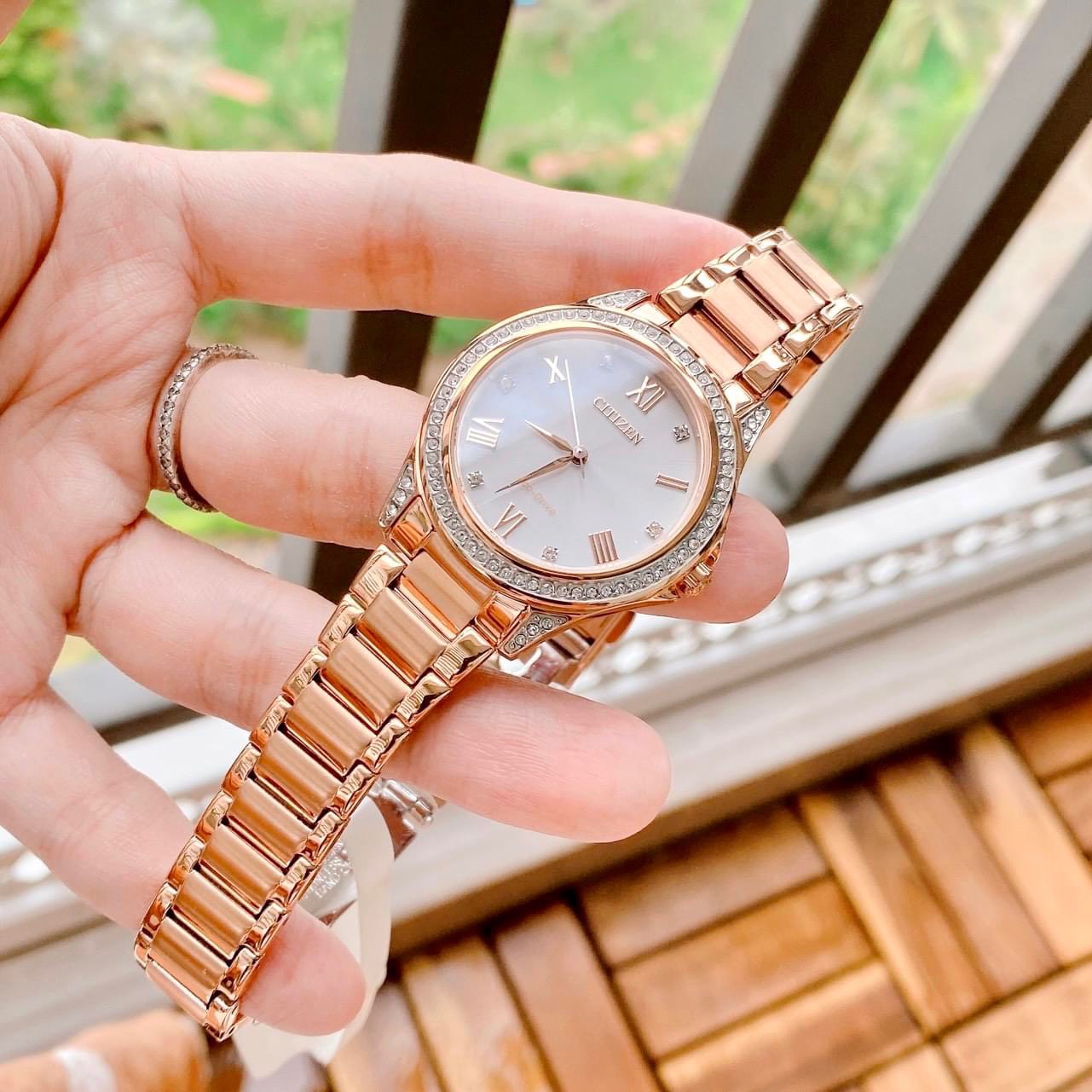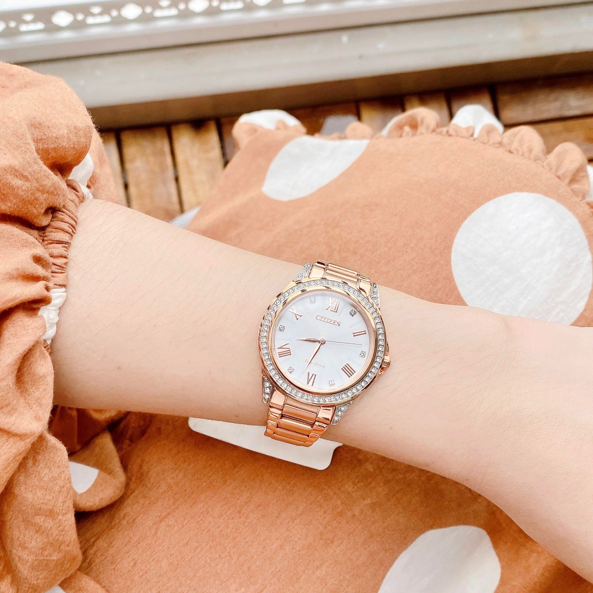 Citizen EM0233-51A được thiết kế với đính đá Swarovski lấp lánh quanh viền, tạo điểm nhấn tinh tế và quyến rũ cho chiếc đồng hồ. Sự kết hợp giữa kim loại mặt vàng hồng và đá Swarovski làm nổi bật vẻ đẹp thời thượng và quý phái.