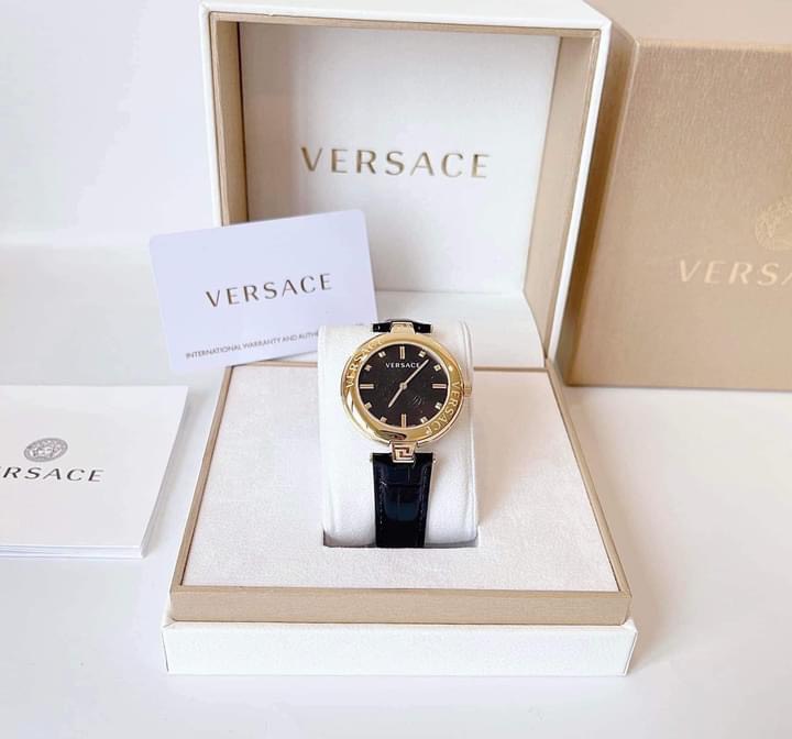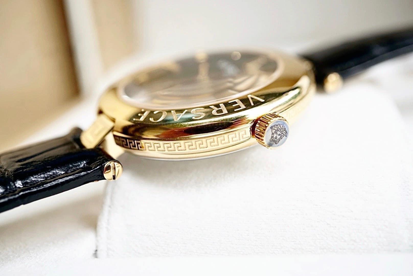 Viền kim loại màu gold với tên thương hiệu khắc nổi bật là một cách thể hiện sự tự tin và kiêu hãnh của Versace. Đây là chi tiết tinh tế mang đến vẻ đẹp lịch lãm và nổi bật cho chiếc đồng hồ.