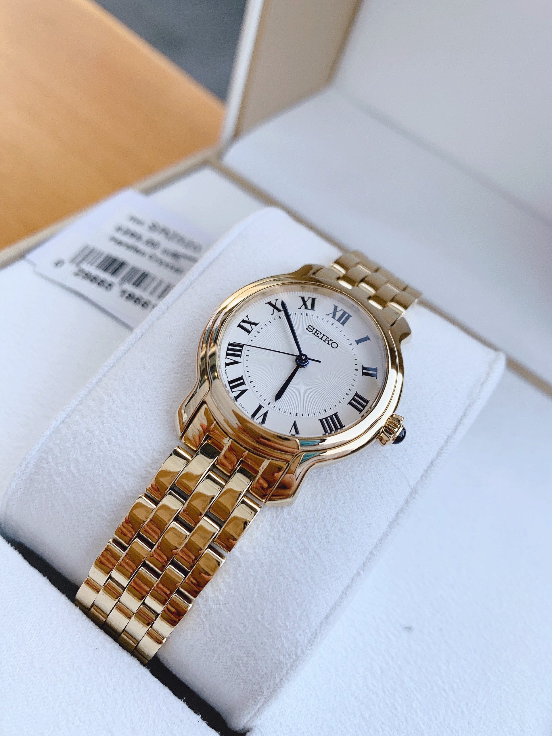 Với thiết kế thật tinh tế, Seiko SRZ520 là món quà tuyệt vời để tặng cho các quý cô, mang đến sự quý phái và sang trọng cho phong cách của họ. Mặt đồng hồ được trang trí bởi những cọc số La Mã cổ điển mạ xanh tinh tế, tạo điểm nhấn đẳng cấp và thu hút mọi ánh nhìn. Tone gold cách điệu, mạ vàng, làm nổi bật và tôn vinh vẻ đẹp đích thực của Seiko SRZ520.